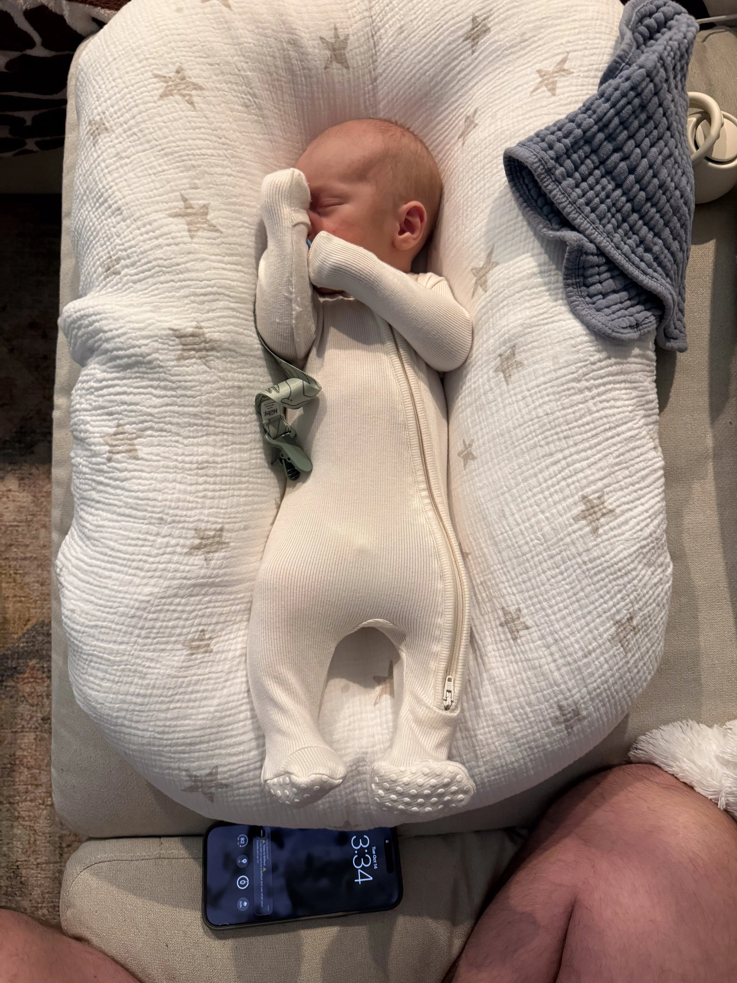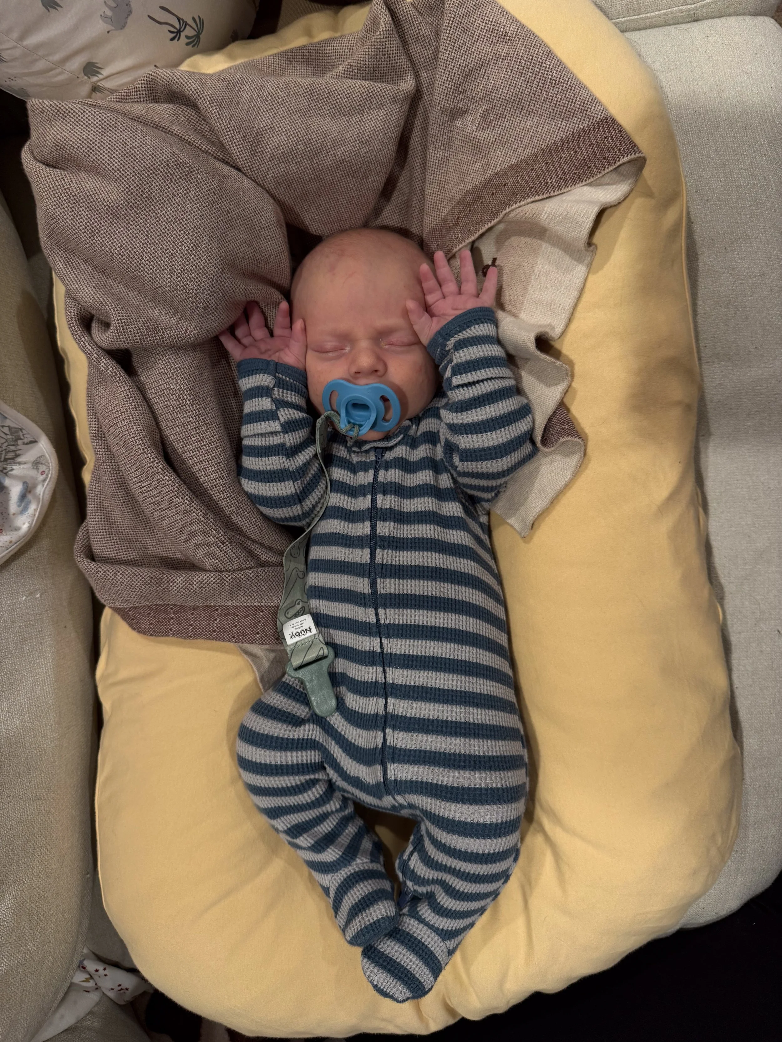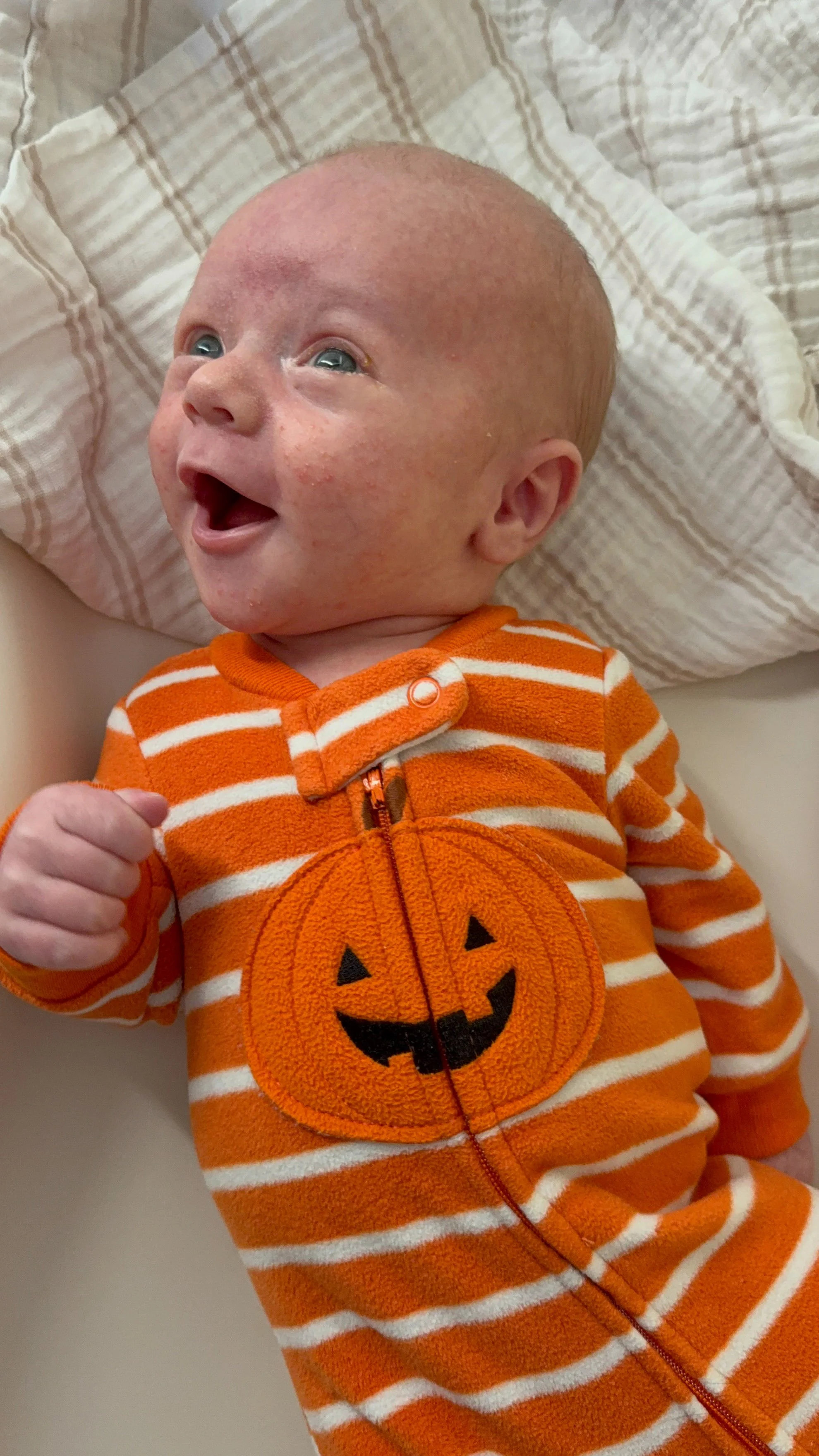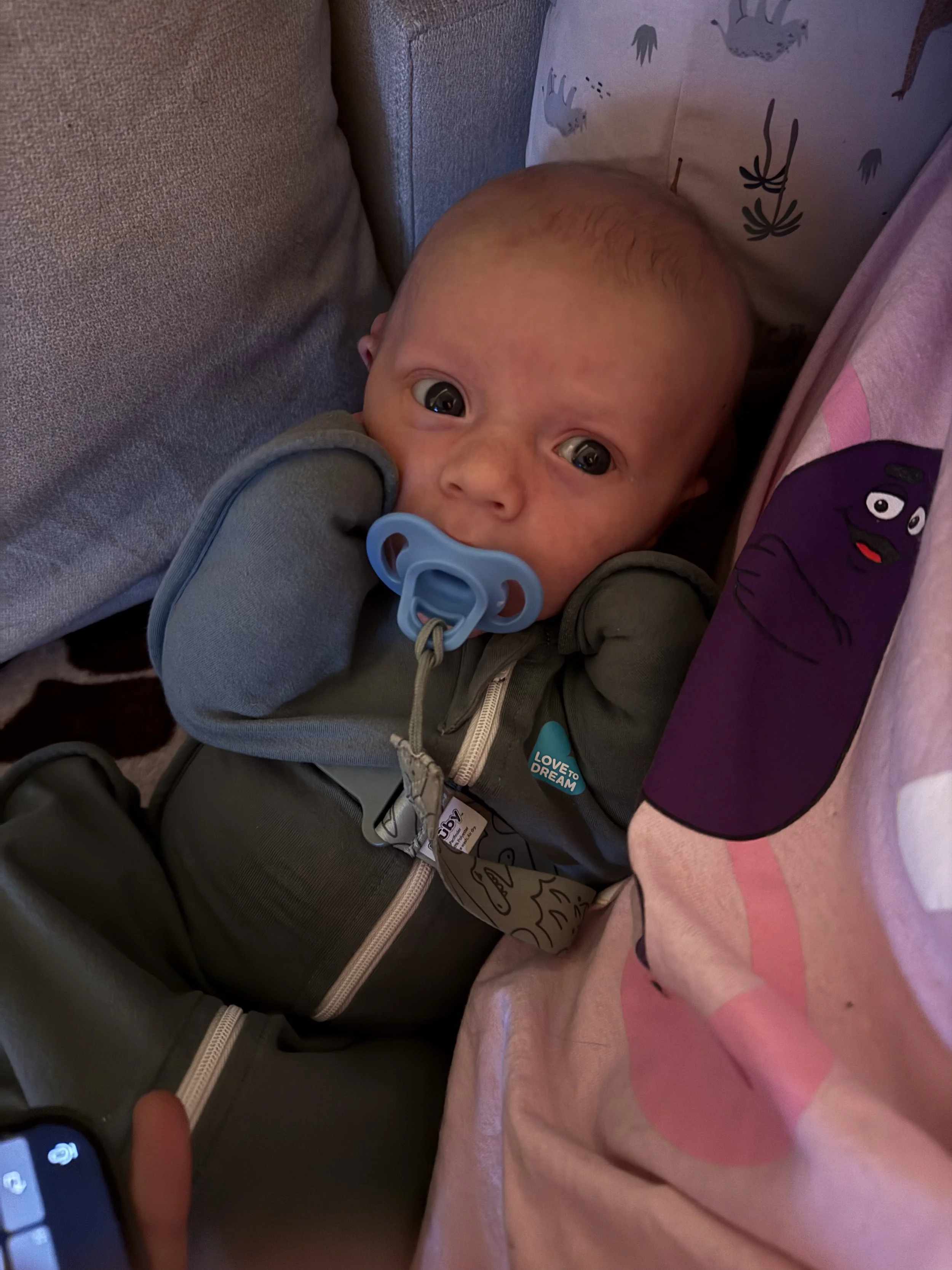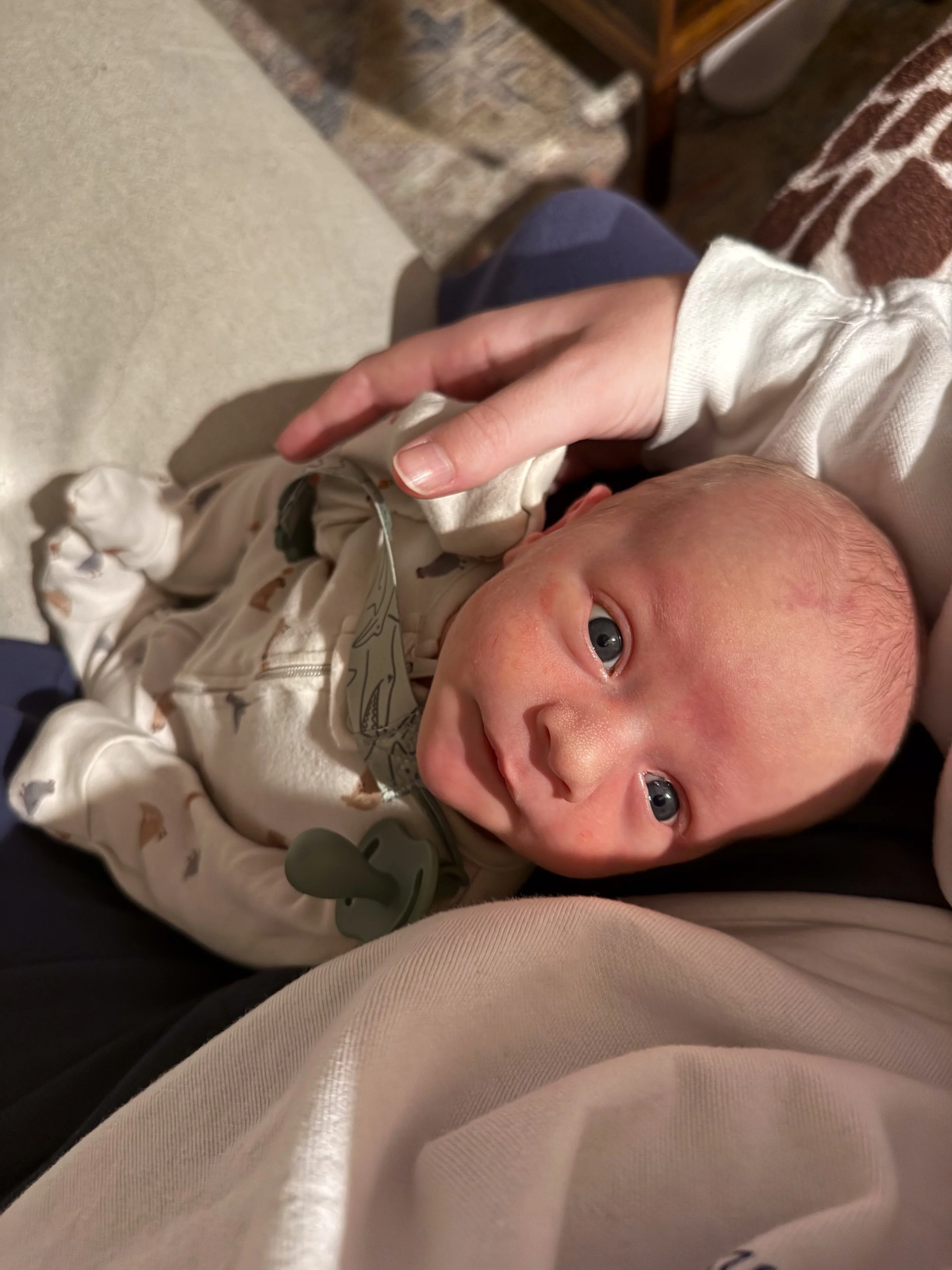 He actually likes tummy time and holds up his head so well! He started smiling at around 3 weeks (usually in the morning) and we’re soaking all of those up.