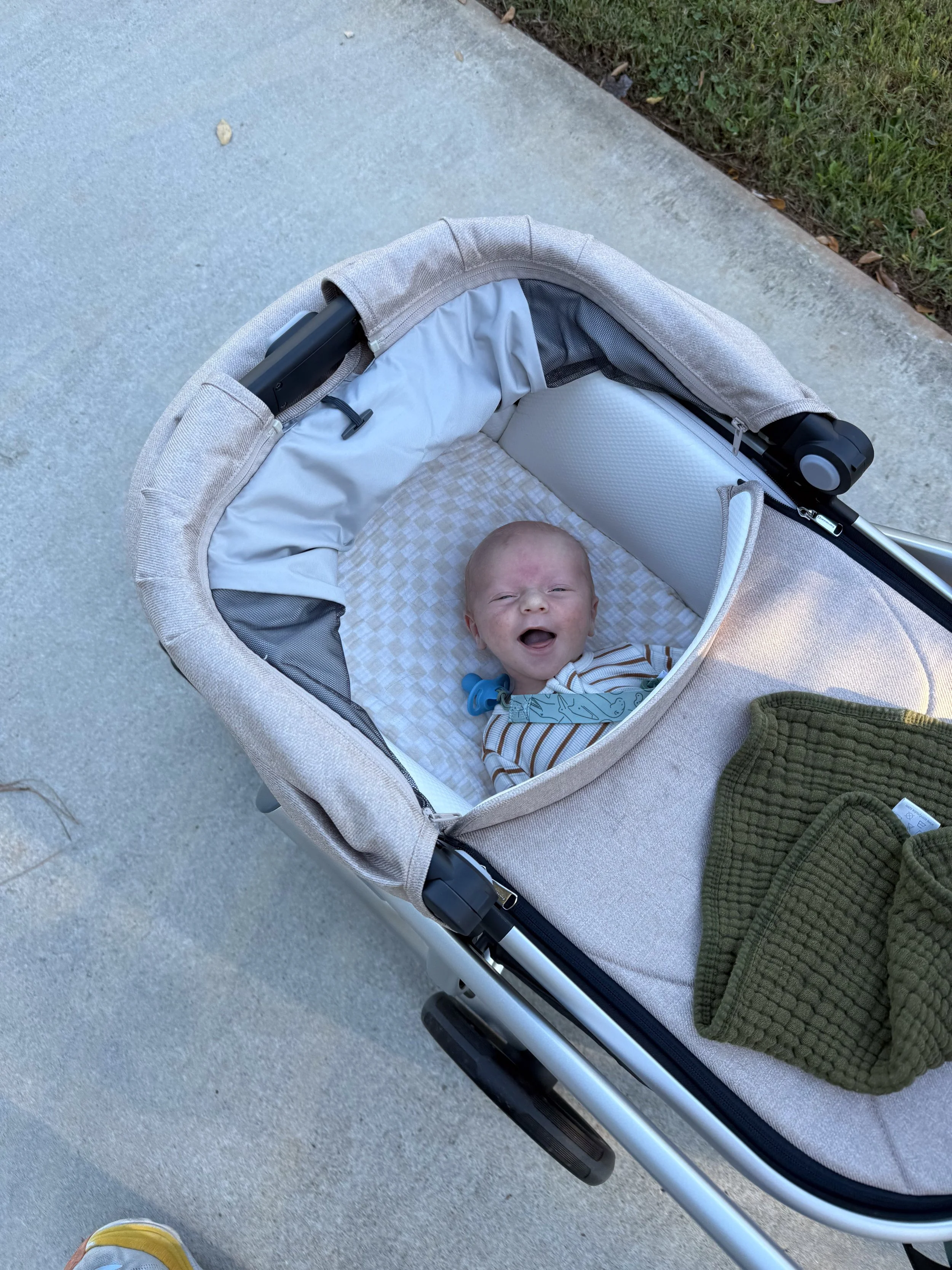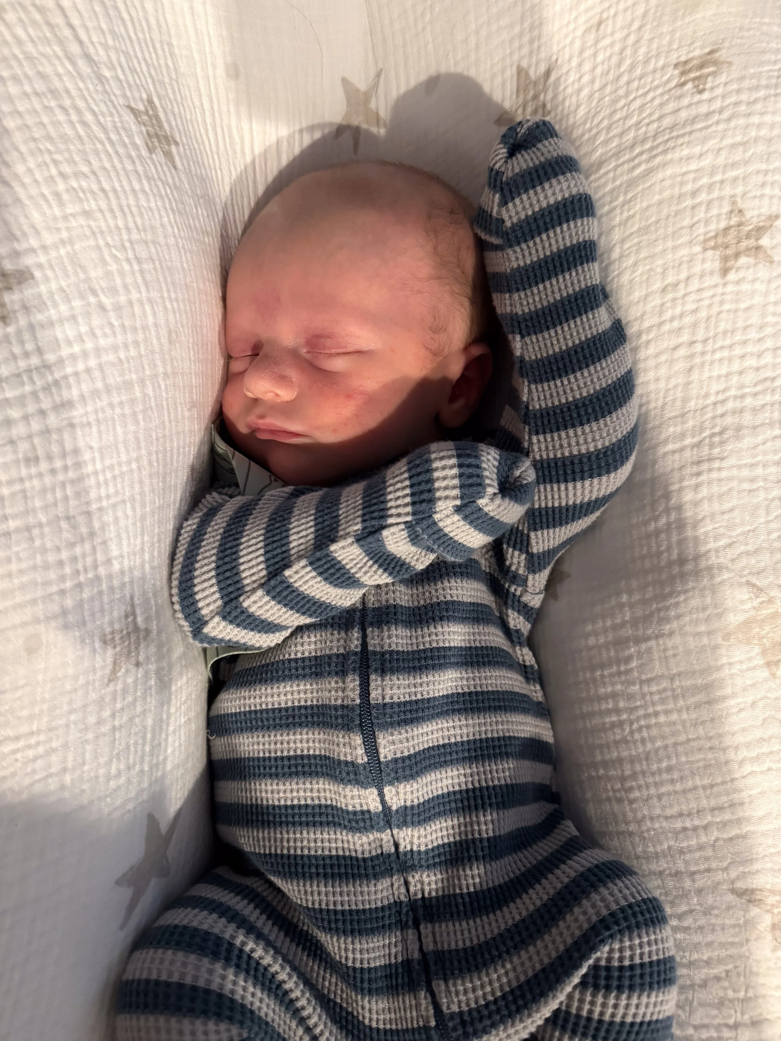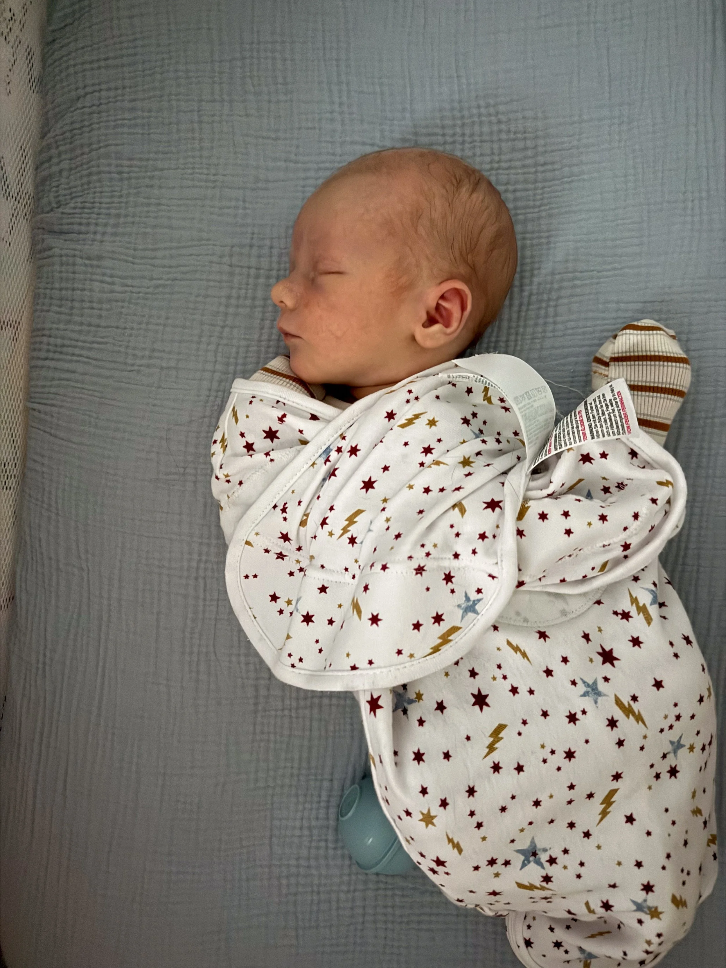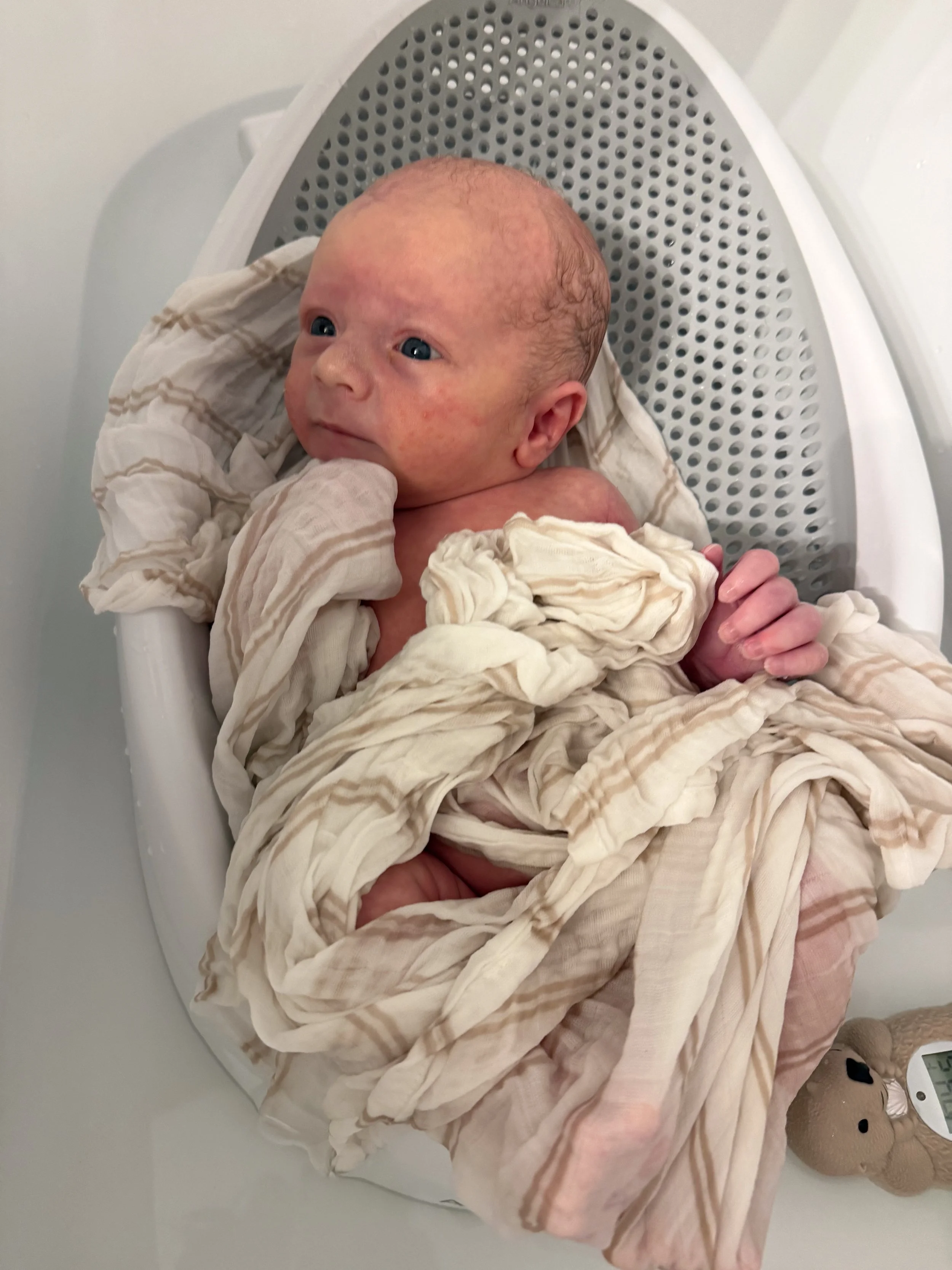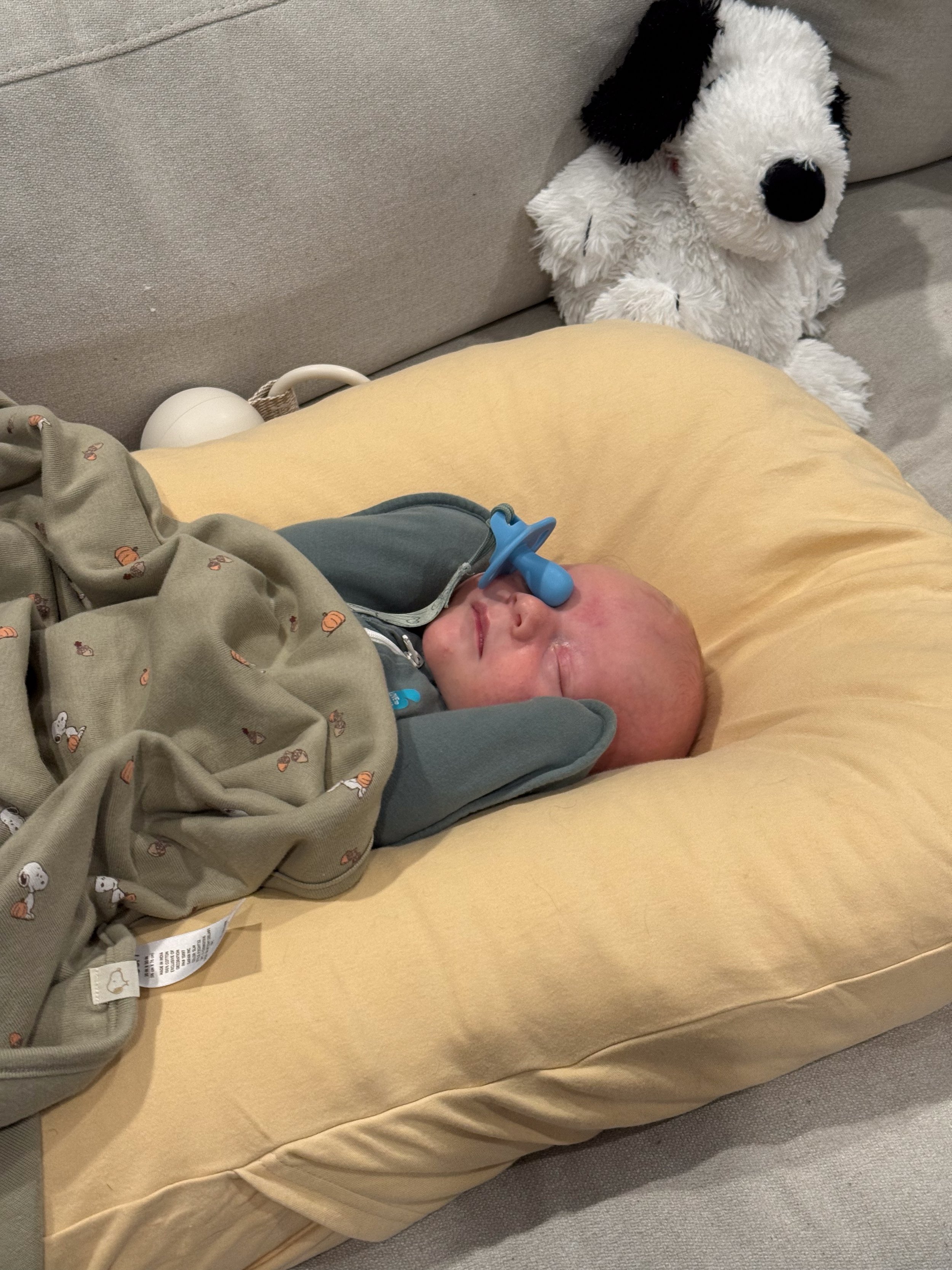He actually likes tummy time and holds up his head so well! He started smiling at around 3 weeks (usually in the morning) and we’re soaking all of those up.