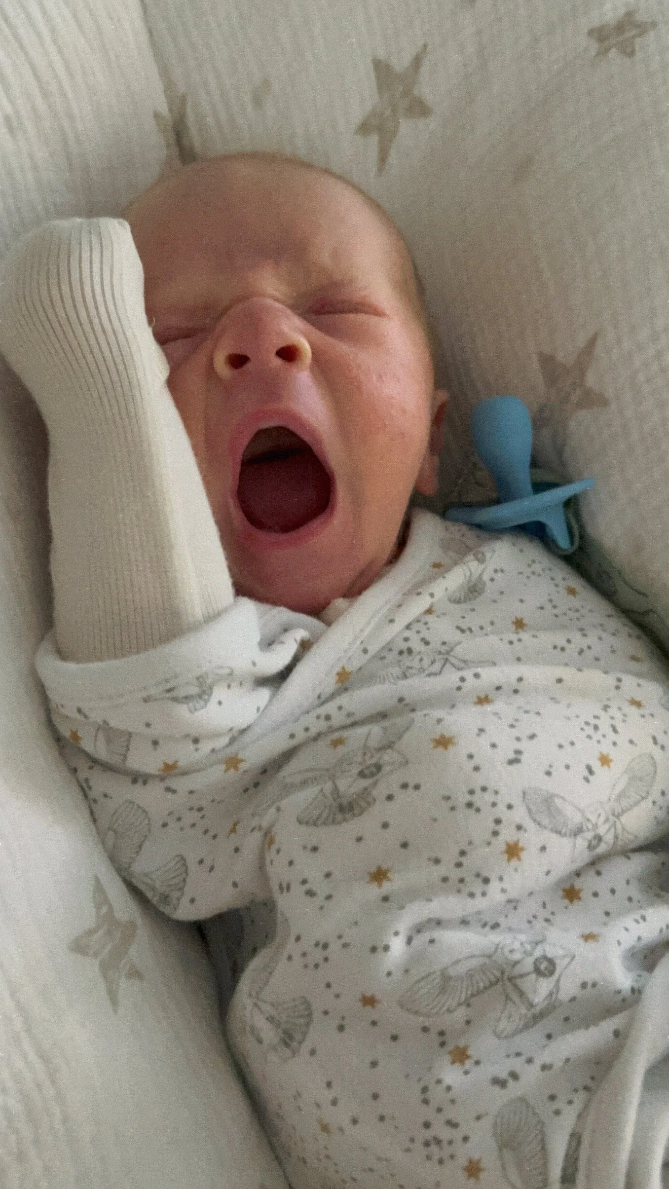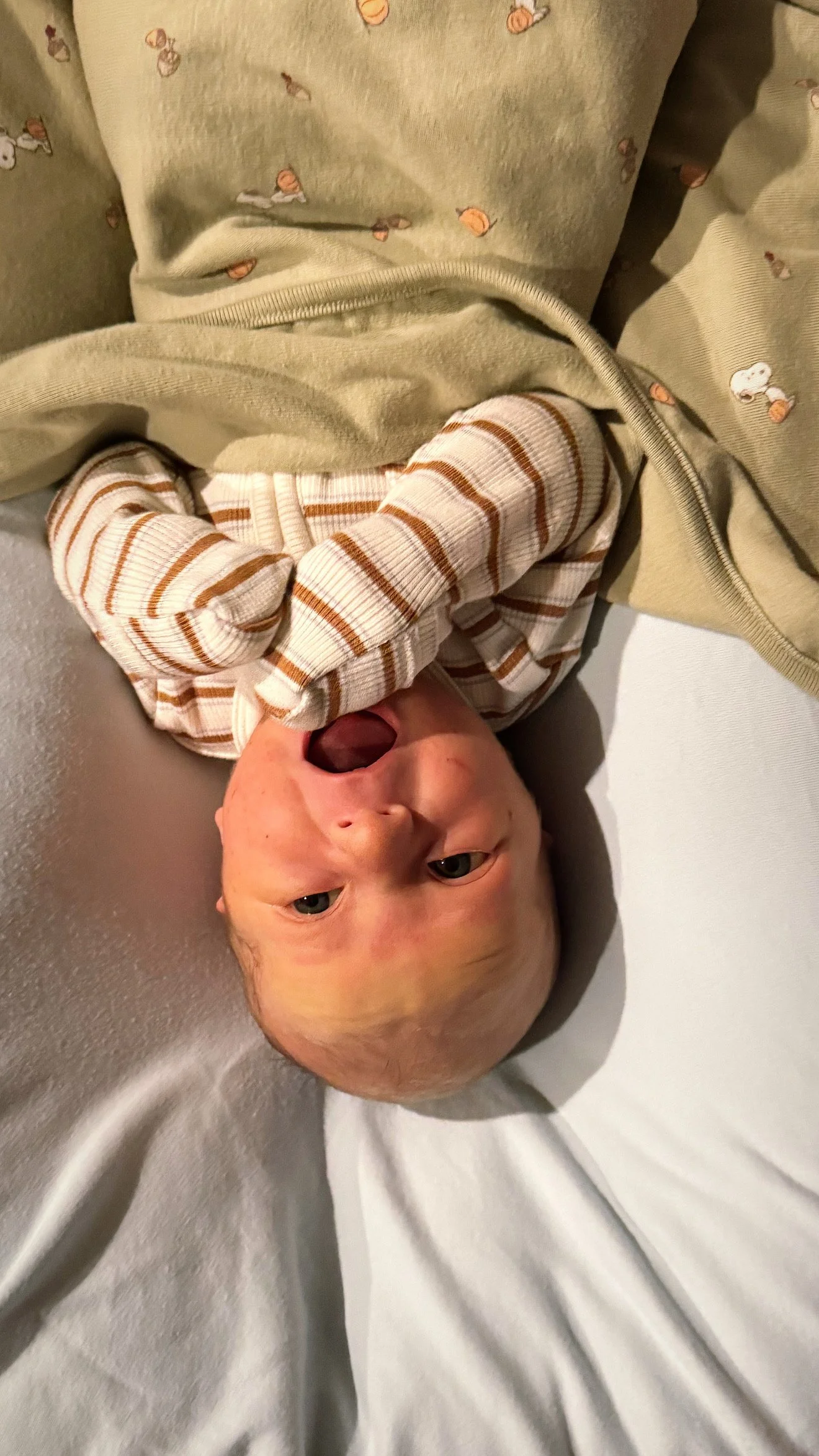 He’s very mobile: kicks and kicks and kicks and throws his arms around and occasionally hits himself in the face. This is probably why he loves to be swaddled: it gives him a break from his limbs.