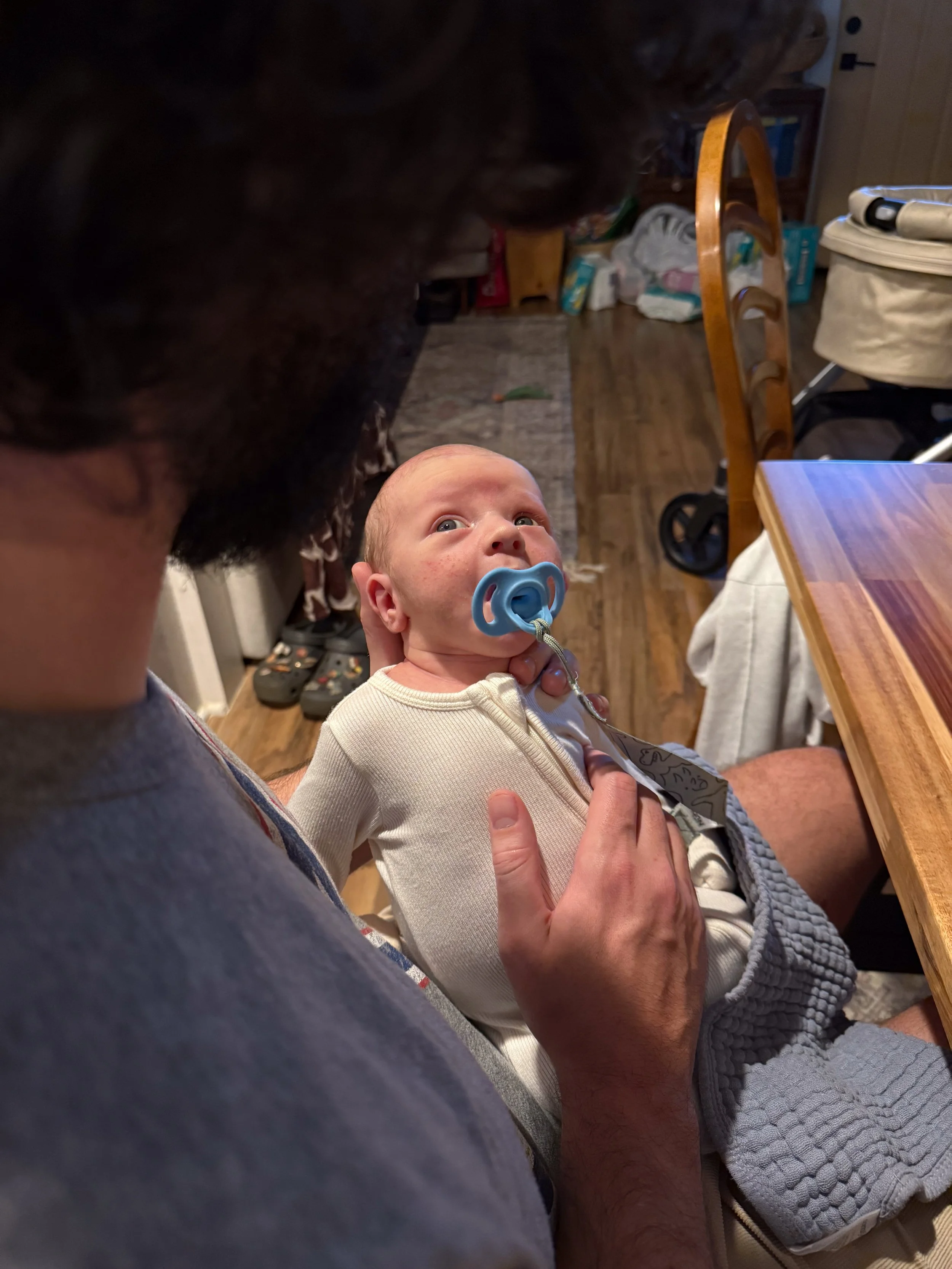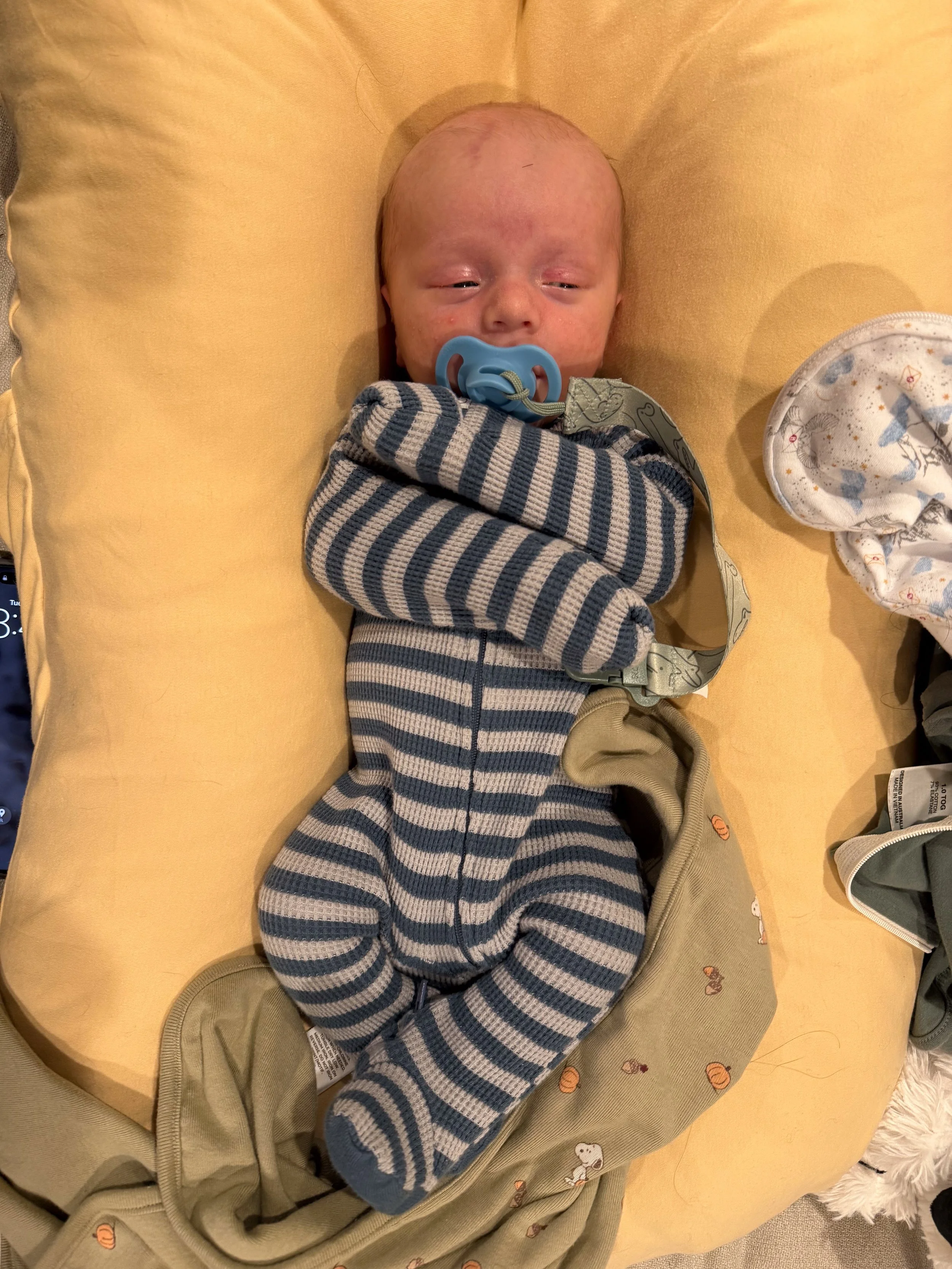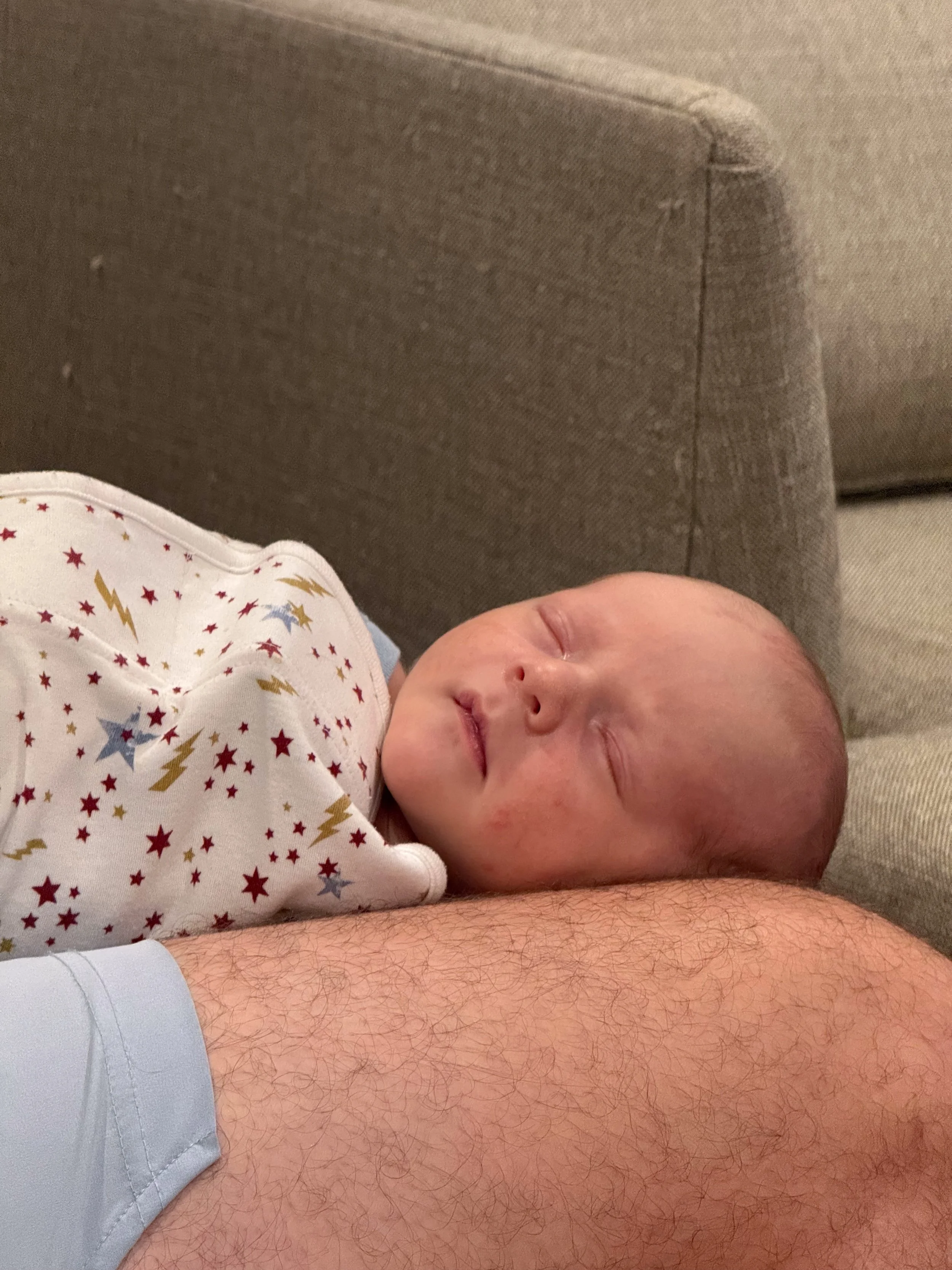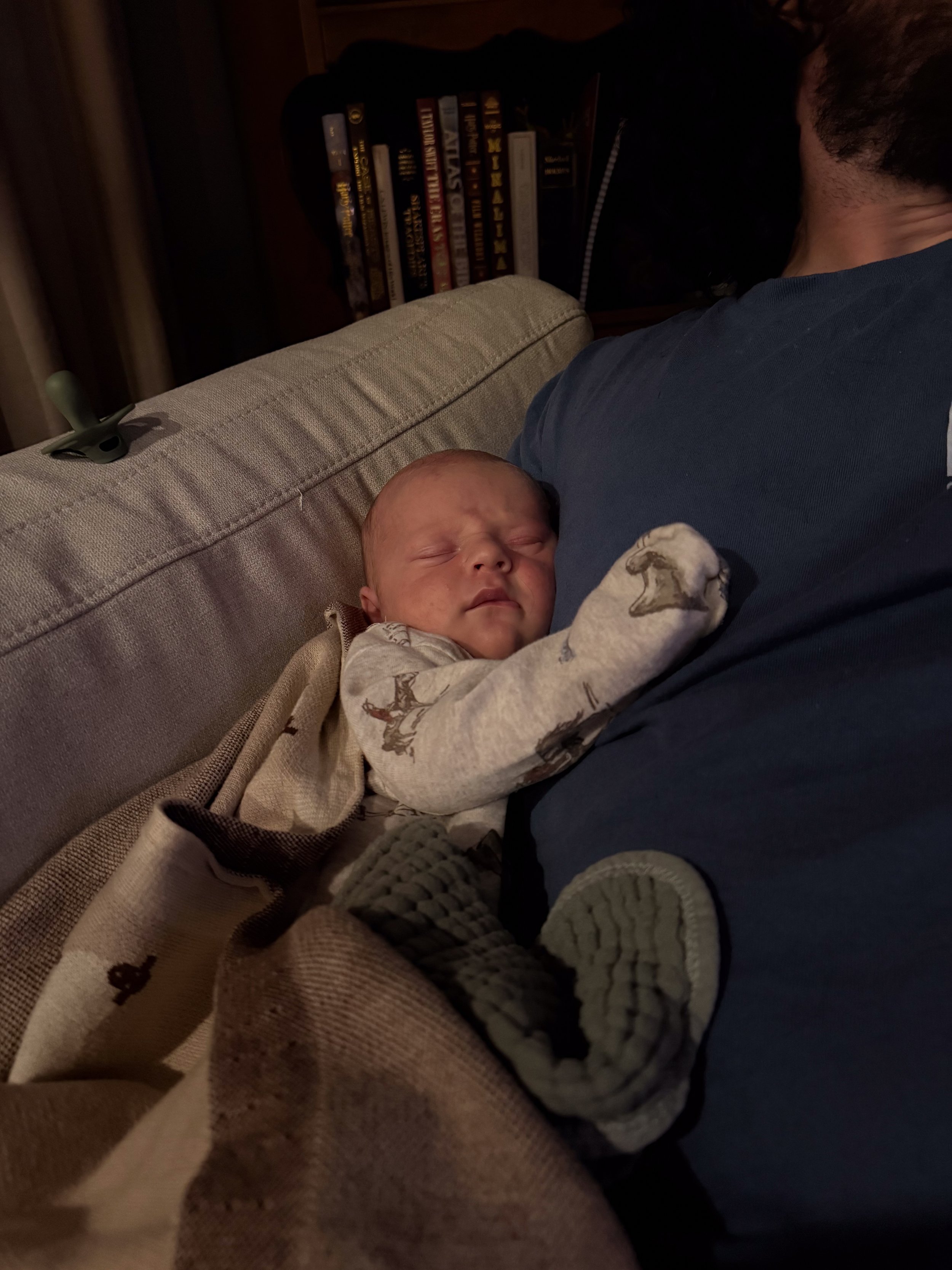 He is starting to grow out of some of the newborn clothes, but most 0-3m clothes are still too big. Funnily enough, even with how long he is, he’s maxing out of most of them in the stomach. Big belly boy.