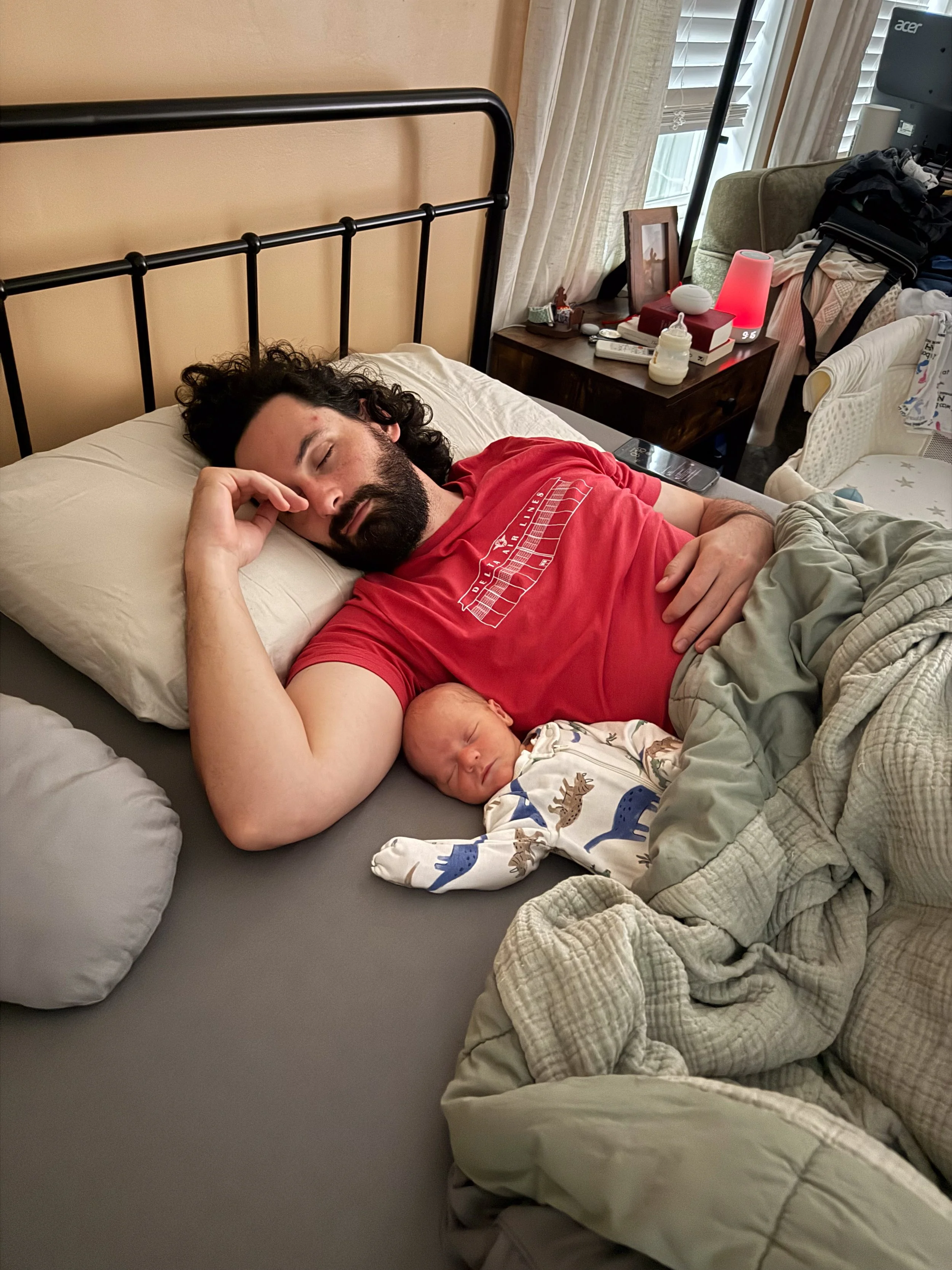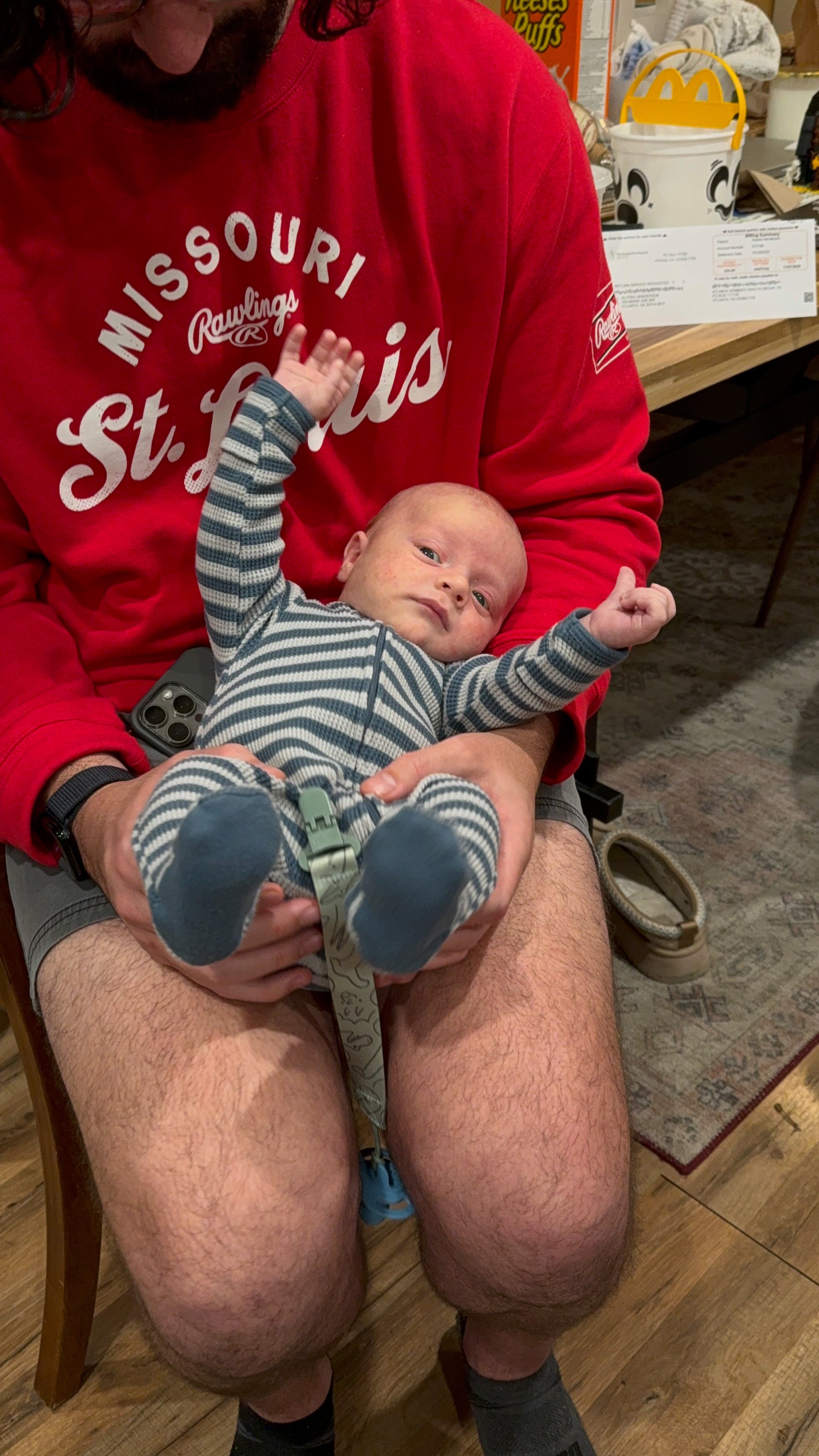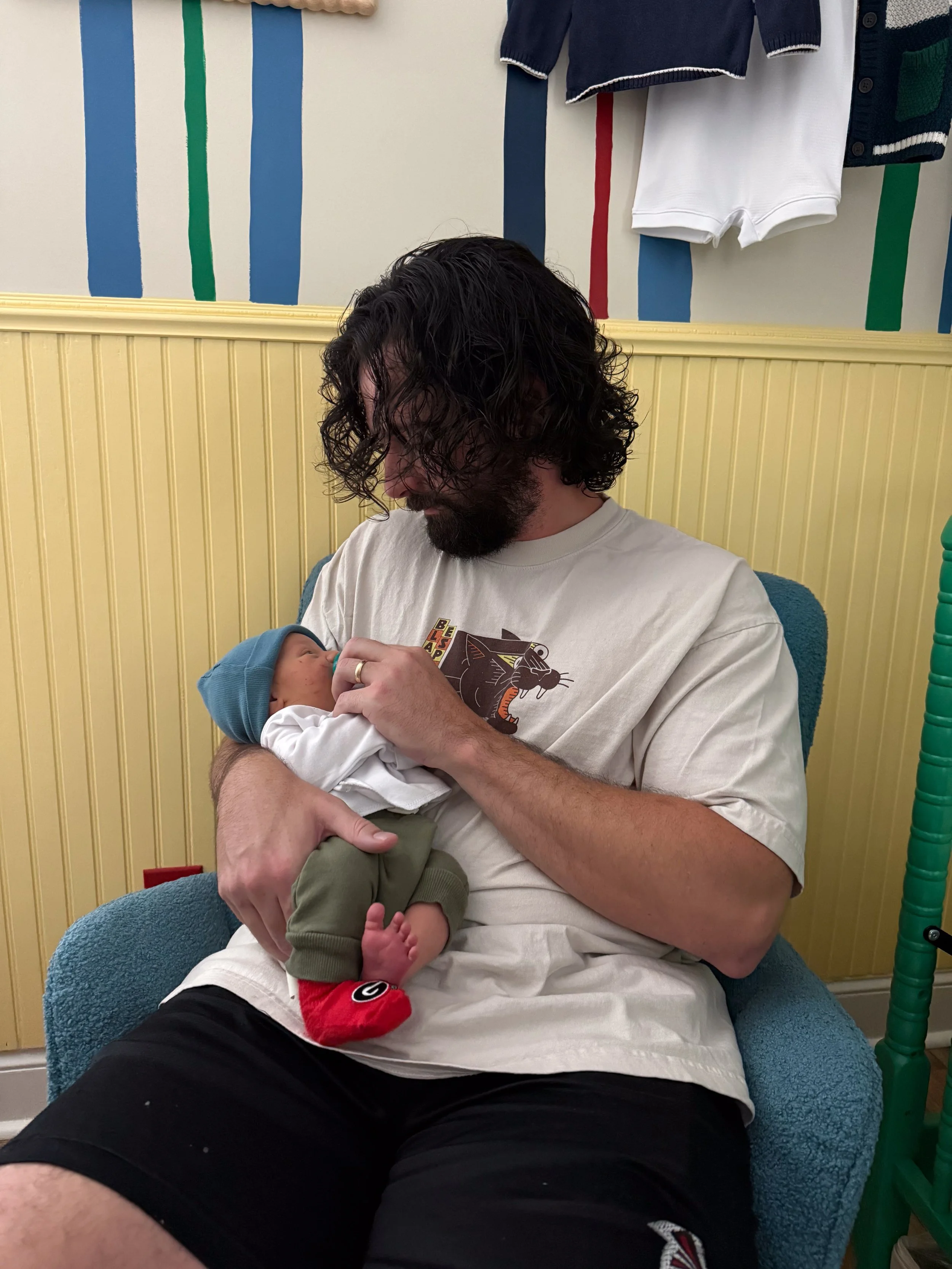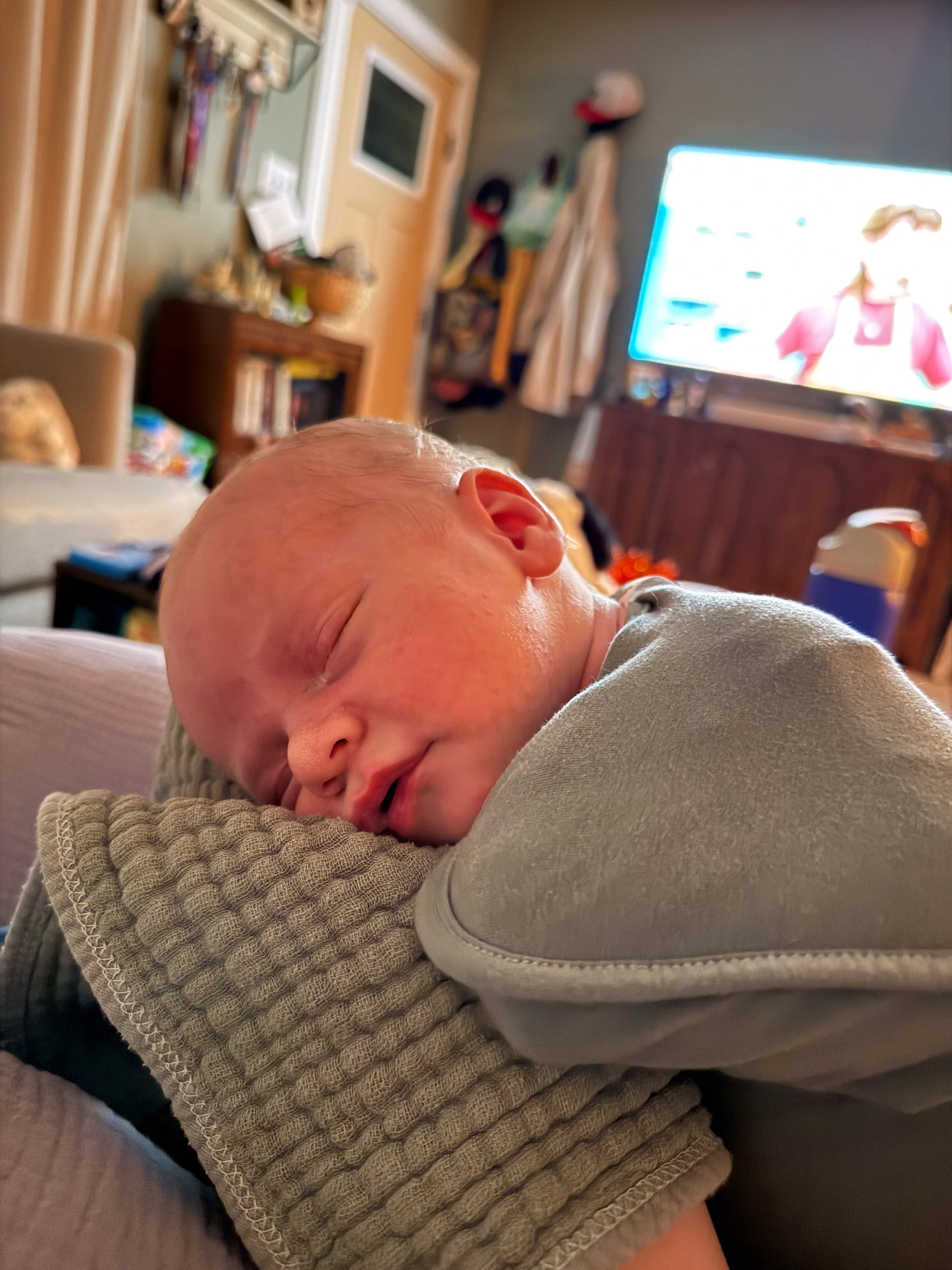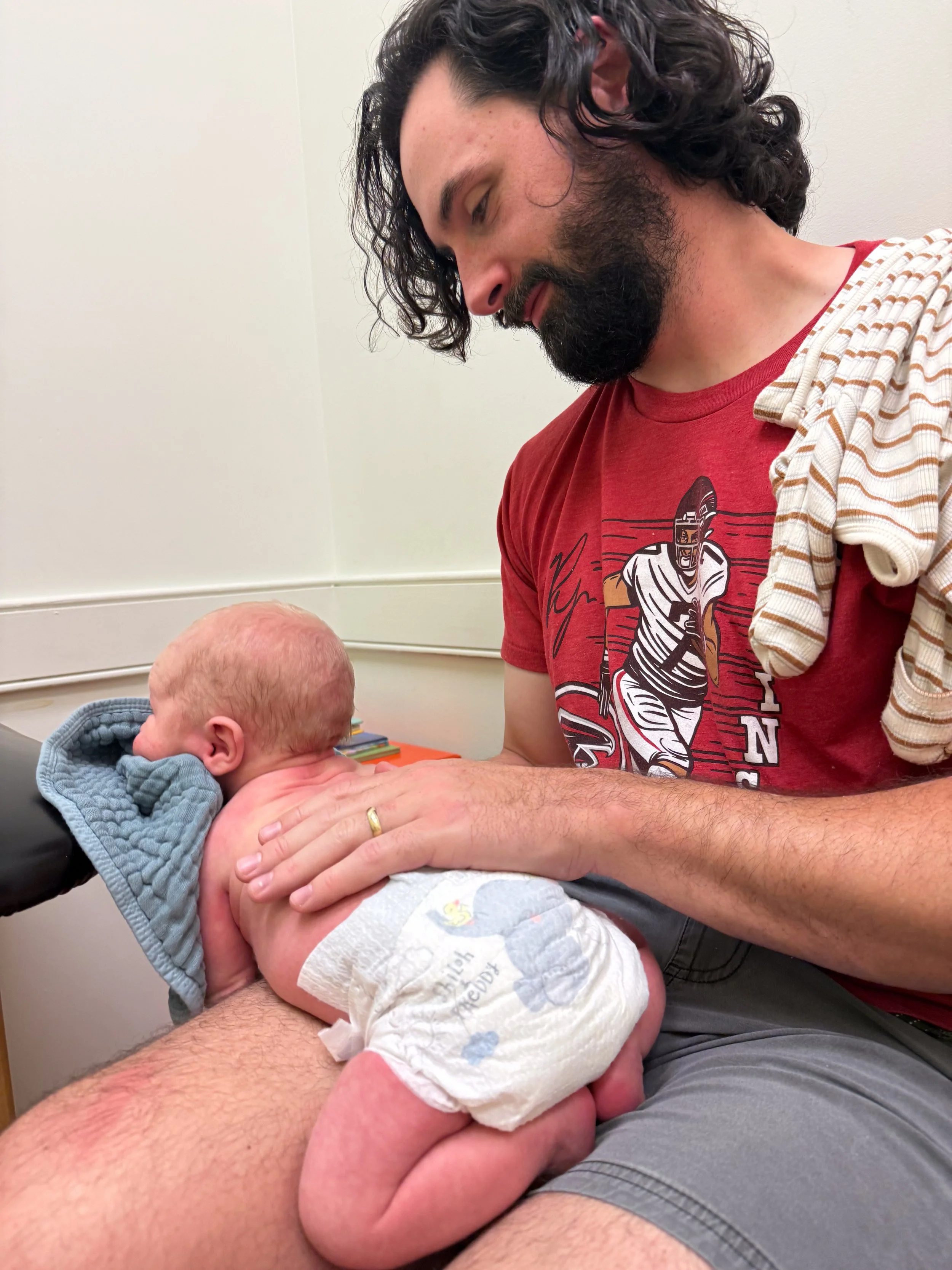 He is starting to grow out of some of the newborn clothes, but most 0-3m clothes are still too big. Funnily enough, even with how long he is, he’s maxing out of most of them in the stomach. Big belly boy.