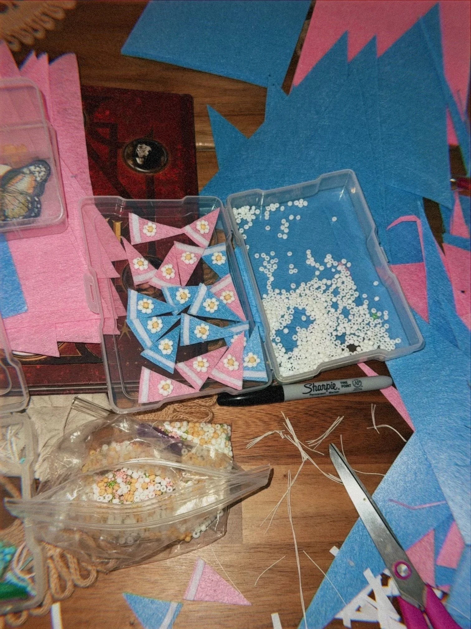 I went a little extra with the table scatters and embroidered some bead flowers onto them lol